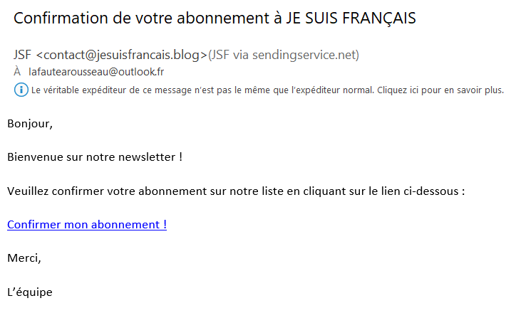 Explication : lorsque vous vous êtes abonnés en inscrivant votre adresse de messagerie sur l’emplacement ad hoc en haut à droite de notre page d’accueil, vous recevez dans l’instant dans votre boîte aux lettres (messagerie) un message vous demandant votre confirmation.