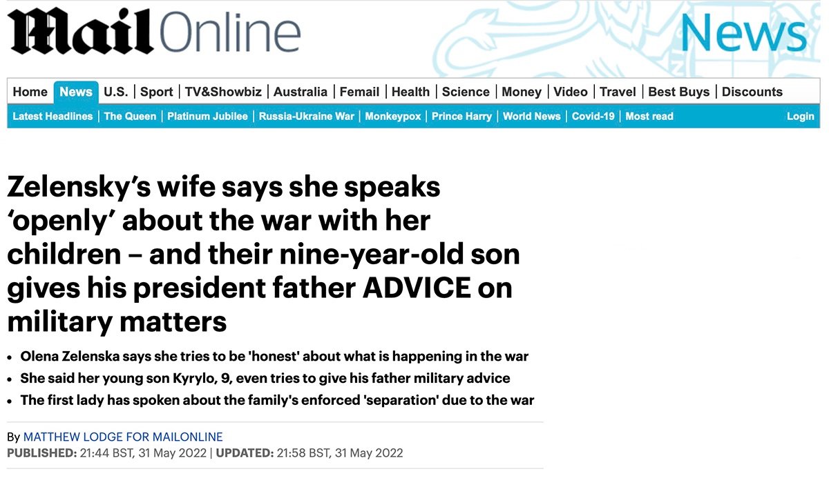 « La femme du président Zelensky a dit discuter ouvertement de la guerre avec ses enfants, et a révélé que son fils âgé de 9 ans donne à son père des conseils sur des sujets militaires. […] Il communique à son père son point de vue sur ce que les forces armées devraient faire. […]