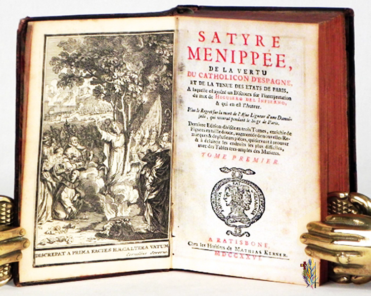 La Satyre Ménippée, de la Vertu du Catholicon d’Espaigne et de la tenuë des estats de Paris (c’est son titre complet) est une œuvre collective satirique, qui mélange – en prose et en vers – les railleries contre la Ligue et ses chefs, trahissant la France et la Légitimité, dans leur alliance avec le roi d’Espagne.