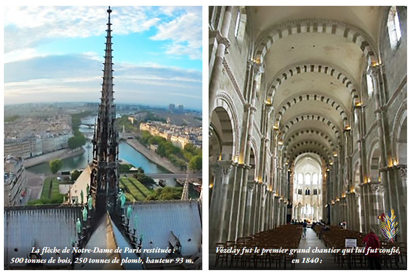 Cependant, c’est surtout sur le gigantesque chantier de Notre-Dame, où il fut appelé avec son associé Jean-Baptiste Lassus, à partir de 1844, qu’il donna la pleine mesure de ses capacités (ci dessous, la nouvelle flèche de la cathédrale). Marcel Aubert donne une description saisissante de l’état de délabrement de Notre-Dame en 1802 :
