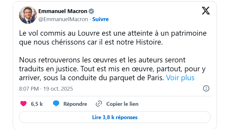 Et puis, il y a le braquage du Louvre. Si j’osais, je dirais qu’on est là aux antipodes du chaos marseillais. Qu’on imagine un instant ce braquage comme élément de scénario d’un film dont la vedette sympathique serait, par exemple, notre Jean-Paul Belmondo. On applaudirait sans retenue. Pas de violence, pas de coups de flingue, de rafales de kalach’, pas d’égorgement au couteau, pas de prise d’otages, rien de tout cela. En quatre ou sept minutes montre en main, un dimanche matin, en plein jour, au cœur de Paris, l’affaire est réglée. Bien sûr, on peut évidemment larmoyer à l’infini sur la perte de ces joyaux patrimoniaux, témoignage magnifique de notre glorieux passé, de notre grandeur de jadis. Mais cette grandeur n’est plus et il n’est pas certain que la France d’aujourd’hui mérite encore de tels joyaux, qu’elle en soit réellement digne. Cela, bien entendu, n’excuse rien, n’efface nullement l’affront qui nous est fait, le préjudice culturel d’un tel vol. Ni d’ailleurs l’humiliation qui va avec, car, une fois de plus, nous faisons beaucoup rire à l’étranger. Pensez donc ! Le plus beau musée du monde incapable de protéger ses trésors. Oui, cela fait rigoler. À nos dépens, bien évidemment.