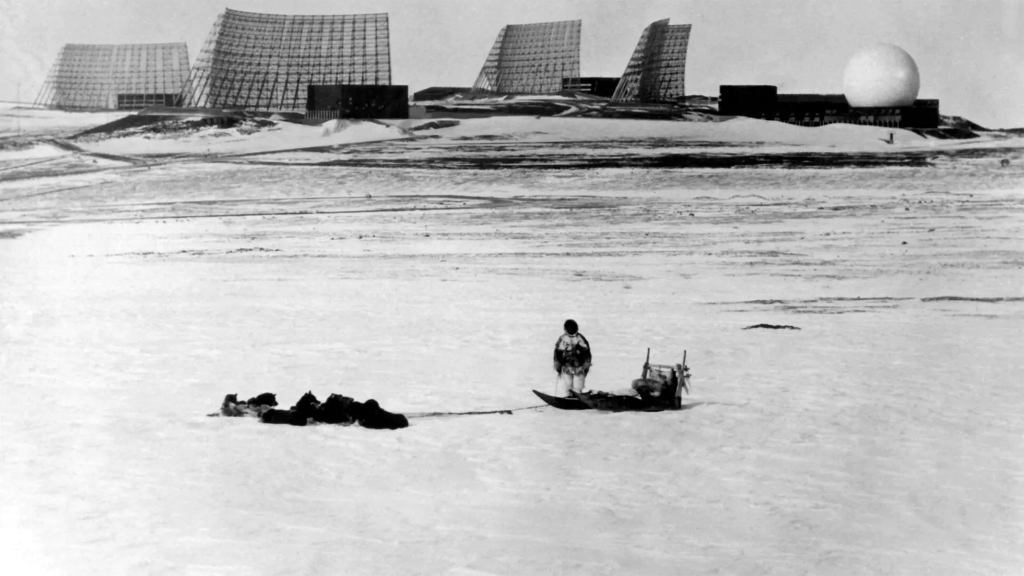 Un Groenlandais avec son traîneau à chiens observe les radars de la base aérienne de Thulé, dans le nord du Groenland, en 1966. NF / AFP
