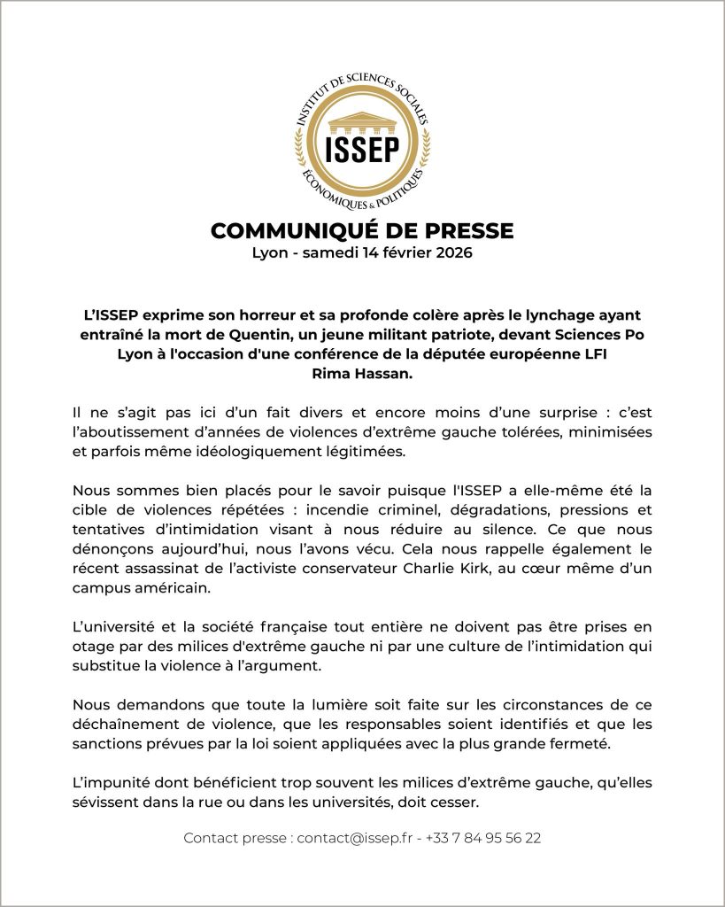 L’ISSEP exprime son horreur et sa profonde colère après le lynchage ayant entraîné la mort de Quentin, un jeune militant patriote, devant Sciences Po Lyon à l’occasion d’une conférence de la députée européenne LFI Rima Hassan.