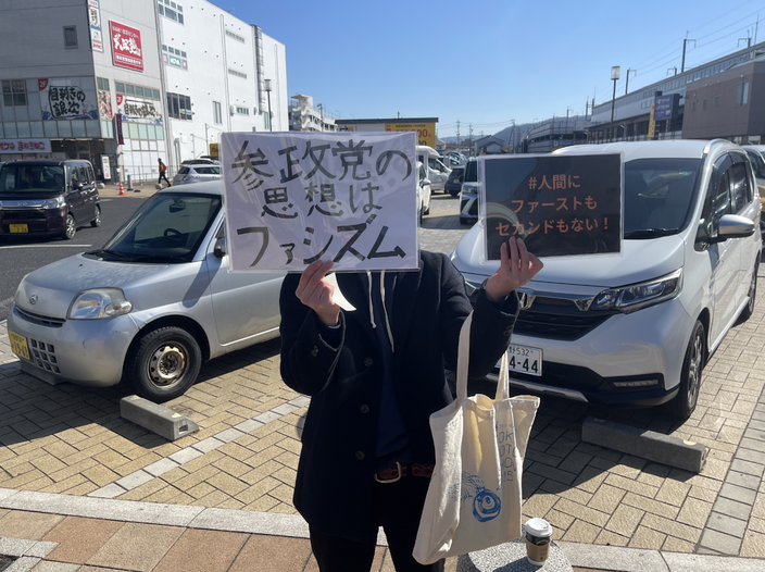 « L’humain en premier ! Il n’y a pas de second ! » : comme un cri muet, un jeune homme brandit des deux mains un carton avec ce slogan sagement révolutionnaire au nez des passants de la gare de Takasaki (au nord-ouest de Tokyo). On le remarque à peine. Quidam anonyme, il est venu protester contre un meeting électoral du parti populiste et nativiste Sanseito. À quelques mètres de lui, des centaines de soutiens, vêtus de la « chemise orange » du parti, applaudissent chaudement les harangues de leur leader Sohei Kamiya contre les étrangers, la vaccination obligatoire, la confusion des genres et autres « tubes » de son répertoire idéologique. Sollicité pour être pris en photo, le militant préfère s’effacer un peu plus : « Ne prenez pas mon visage, juste mon panneau », demande-t-il derrière un opportun masque anti-rhume.