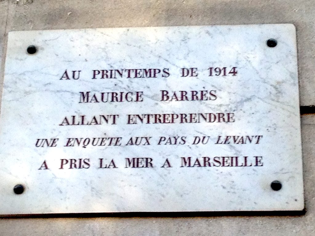 A Marseille, un hommage particulier lui a été rendu avec l’existence d’une plaque à la place Sadi Carnot. Elle porte l’inscription : « Au printemps de 1914 Maurice Barrès allant entreprendre une enquête aux pays du Levant a pris la mer à Marseille ». Ces lignes sont une référence au voyage que l’écrivain accomplit en mai-juin 1914 en Egypte, Syrie et Liban.