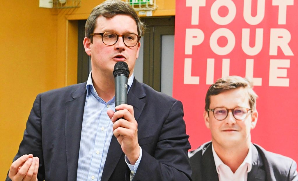 Arnaud Deslandes, candidat socialiste à Lille, lors d’une réunion publique avec des habitants du quartier Saint-Maurice Pellevoisin, 9 mars 2026. © SIPA
