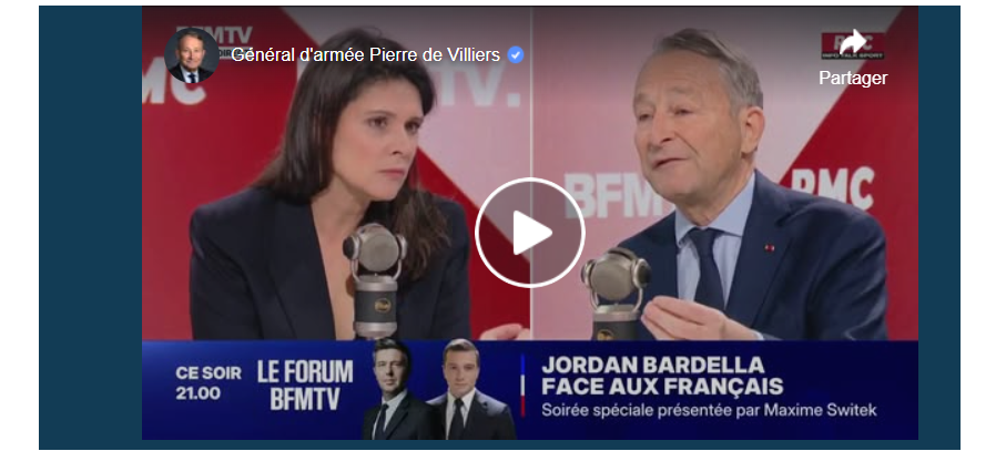 Général d’armée Pierre de Villiers Le Général Pierre de Villiers répond – le 11 décembre – aux questions d’Apolline de Malherbe dans le « Face à Face » sur BFMTV et RMC Info Talk Sport à l’occasion de la sortie de « Pour le succès des armes de la France » (Fayard), son nouveau livre. …